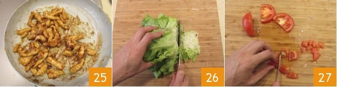 Cook over high heat for 5-6 minutes until the chicken caramelizes and forms a crispy crust 25. Set aside, and move on to the other ingredients for the burritos. Wash the head of lettuce, remove the base and the harder parts 26, and roughly chop the leaves. Dice the tomato 27.