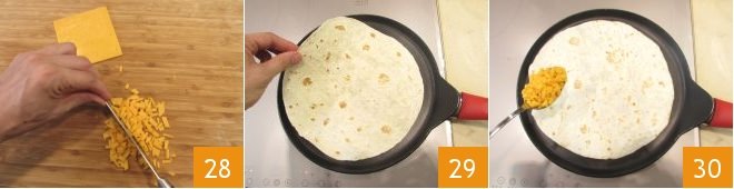 Now, shred the cheddar 28, keeping aside 4 whole slices for later. In a special grill (or a large non-stick pan), toast the tortilla on both sides 29, then sprinkle the shredded cheddar in the center 30 and let it melt.