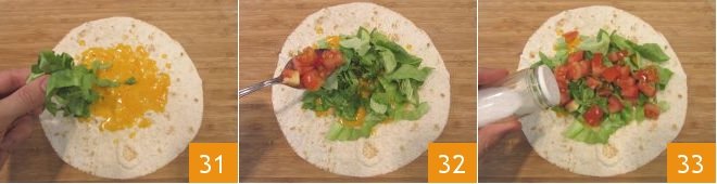 Transfer the tortilla to a plate or cutting board, and fill it with the lettuce 31 and the tomato 32. Adjust with salt 33.