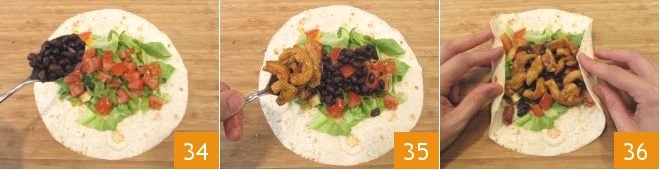 Add the black beans 34 and the caramelized chicken 35. Now take the two lateral edges of the tortilla and fold them over the filling 36.