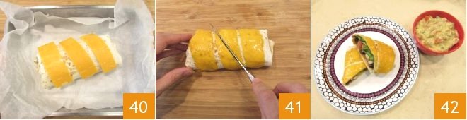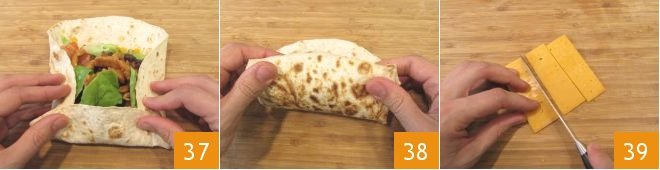 Take the bottom edge of the tortilla and fold it over as well 37 and continue wrapping the burrito until it is sealed 38. Repeat the same operations to make the other burritos! Then cut each of the 4 remaining cheddar slices into 3 strips 39.