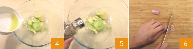 Add the juice to the avocado flesh 4. Adjust with salt and pepper 5. Move on to the other ingredients for the sauce: finely chop the shallot 5.