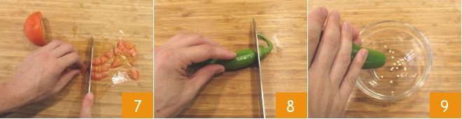 and dice the tomato 6. Make a slit in the green chili below the stem 7 and, turning it upside down, empty out the seeds 8.