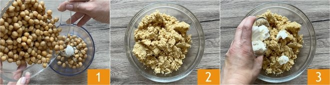 To make chickpea nuggets, drain the precooked chickpeas, place in the mixer 1 and blend into a puree 2. Add the spreadable fresh cheese 3.