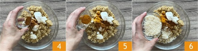 Season with the paprika 4 and turmeric 5, then add the grated Grana Padana PDO cheese 6.
