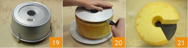 Then turn the pan upside down and rest it on the special feet of the pan 19 so that the cake gets air, cools down and separates at the edges by itself. When the chiffon cake has completely cooled, remove the top of the pan using a thin, sharp knife 20. Your chiffon cake is ready to be sprinkled with powdered sugar to taste 21!