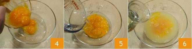 In another bowl, separate the yolks from the egg whites of 6 large eggs 4, weighing about 14 oz in total (390-400 g), and keep the egg whites aside. Add water at room temperature 5 and the sunflower seed oil 6 to the yolks.