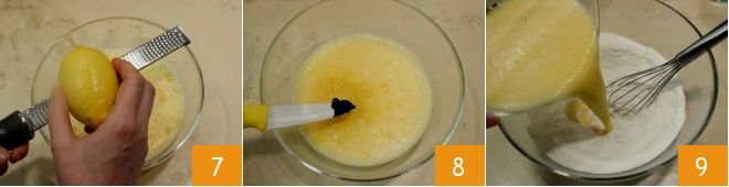 Then grate the rind of an untreated lemon 7 and cut a vanilla bean to extract the seeds with the tip of a small knife and add them to the egg yolk mixture 8. Whisk the mixture until you get a homogeneous cream, there will be no need to whip it. Then mix it with the dry ingredients (flour, sugar and baking powder), adding all at once 9.
