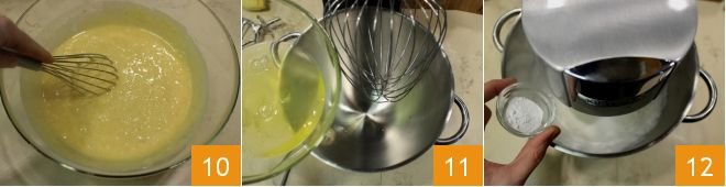 Whisk until the mixture is smooth and creamy 10. Leave this mixture aside for a moment and pour the egg whites into the bowl of a stand mixer 11 (a hand mixer can be used as well), and then beat the egg whites. When they are white and frothy, pour in the cream of tartar 12 and keep mixing for a few minutes.