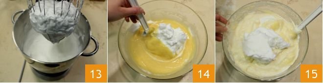 Once the egg whites have been beaten 13, add a part to the mixture kept aside 14 and stir quickly with a spatula to dilute the mixture. Then add the remaining egg whites a little at a time, continuously stirring with a spatula 15 from top to bottom so as not to deflate the egg whites.