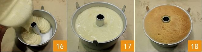 Now that the cake dough is ready, pour it gently into the chiffon cake pan: we used a standard tube pan with an 8 1/2" (22 cm) diameter bottom, 10" (26 cm) surface diameter and 4" (10 cm) height (it should not be buttered and floured) 16, trying to distribute it evenly 17. Then bake the chiffon cake in a static oven preheated to 325° F (160° C) for about 60 minutes (for a ventilated oven 300° F (150° C) for 45-50 minutes), placing the cake on the lower oven rack. Once baked, take it out of the oven 18.
