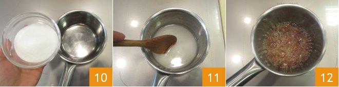 While the tartlets are in the oven, prepare the toffee sauce: pour the water into a saucepan, add the sugar 10 and stir to mix the two ingredients well 11, then light the heat and let it come to a boil over medium heat without stirring anymore. When the mixture has taken on a not too dark amber color 12, remove the saucepan from the heat