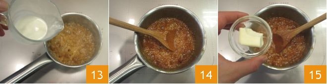 and pour the heavy cream a little at a time, mixing in the meantime with a wooden spoon; take care to add the cream gradually as indicated, paying close attention to the steam and bubbles that will form (13-14). Finally, add the piece of butter 15
