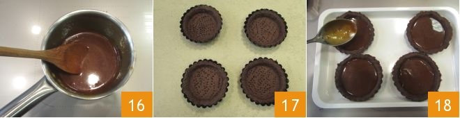 and continue to mix to mix it with the mixture 16. Take the now cold tartlets 17, take them out of the mold and fill them with a couple of tablespoons of toffee sauce on the bottom 18. Let cool to room temperature.