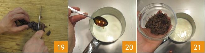 At this point take care of the ganache: chop the dark chocolate with a knife 19, then heat the heavy cream in a saucepan over low heat with the addition of a teaspoon of honey 20; when the cream has come to touch the boil, remove it from the heat and add the chopped dark chocolate 21,