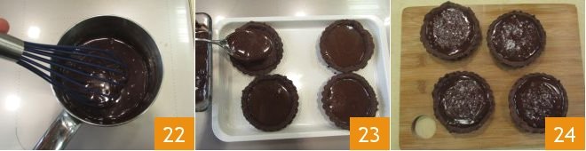 stirring with a whisk until completely dissolved 22. If necessary, you can puree the mixture with an immersion blender to obtain a smoother consistency. Once ready, pour the ganache over the toffee sauce layer until it reaches the edge of the tartlets 23, then garnish with salt flakes to taste. Your chocolate toffee tartlets are ready to be enjoyed 24!