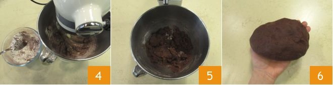 and immediately, with a spoon, gradually pour in the flour mixed and sifted together with the bitter cocoa 4. Work the dough as little as possible, just long enough to obtain a homogeneous mixture 5. Transfer the mixture to the work surface and very quickly form a loaf by hand (just compact the pastry) 6; Wrap the cocoa shortcrust pastry in transparent film and let it rest in the refrigerator for at least 30 minutes.
