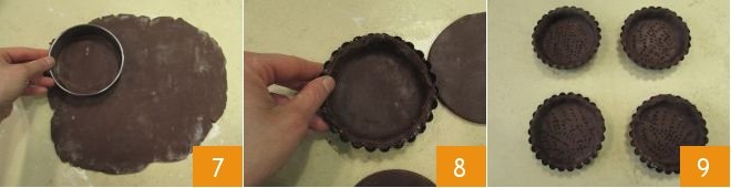 After the rest time, preheat the oven to 392°F (200°C) in static mode. While the oven reaches the required temperature, roll out the dough with a rolling pin on a lightly floured surface to a thickness of about 5 mm. Take a pastry ring with a diameter of 11 cm and cut 4 discs from the dough obtained 7. Place each disc inside a tartlet mold with a scalloped edge with a diameter of 10 cm 8, then prick the bottom with the prongs of a fork 9. Bake the tartlets in the preheated static oven at 392°F (200°C) for about 20 minutes (times may vary slightly based on the power of your oven), placing them on the middle shelf. When they are ready, take them out and let them cool.