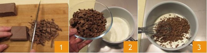 To make the chocolate hazelnut truffles, finely chop the gianduia chocolate 1, then heat the milk in a saucepan, add the chopped chocolate 2 and stir with a whisk 3 until fully dissolved,