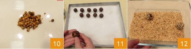 Place the caramelized hazelnuts on a tray lined with parchment paper, or on a silicon board 10, separate the hazelnuts to prevent them from sticking together as they cool. Now assemble the chocolates: take the hardened gianduia mixture, shape into balls around the size of a walnut, using a spoon or a corer. Shape a small cavity in the middle and add a caramelized hazelnut 11, then roll each piece into a ball to cover the center, place on a tray lined with parchment paper and leave in the refrigerator to harden, for 5 minutes. Take the gianduia balls and dip them in the chopped hazelnuts, to fully coat the surface 12.