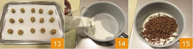 Place them on the tray covered with a sheet of parchment paper 13 and store them in the refrigerator. Now prepare the coating: heat the milk 14 in a pan, then add the finely chopped gianduia chocolate 15 and stir with a whisk until fully dissolved; this time you'll need to obtain a smoother sauce. Place the coating sauce in a bowl.