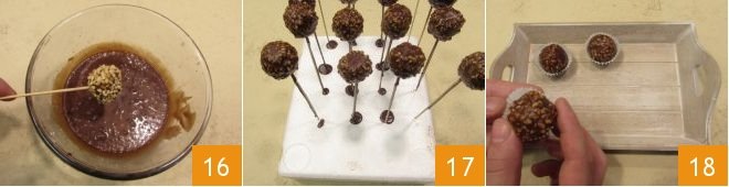 Skewer the gianduia pieces with a wood skewer and dip them in the sauce to full coat them 16, then place the skewer on a polystyrene base 17, which will make it easier for the coating to dry. Place back in the refrigerator for 30 minutes, for the coating to harden. Once this time is up, remove the skewers from the pralines and place them in paper cups 18: your delicious chocolate hazelnut truffles are ready to be enjoyed.