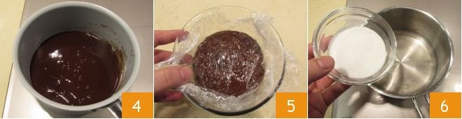 to obtain a homogeneous sauce 4, which you can then place in a bowl and cover with plastic wrap 5. Leave it to cool to room temperature and then place it in the refrigerator to firm up, for at least 30 minutes. In the meantime, caramelize the hazelnuts: place the water in a saucepan, add the granulated sugar 6 and heat on a low flame to dissolve the sugar,