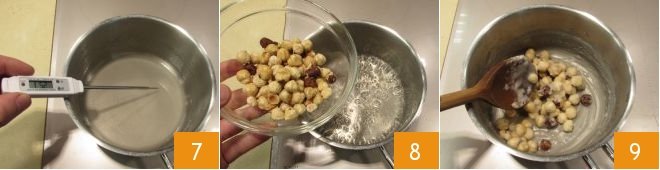 monitor the temperature of the syrup with a food thermometer 7; when it reaches 240°F (115°C), remove from the flame and add the whole hazelnuts 8; stir to obtain a sandy consistency 9. Now place the pan back on the stove and fully dissolve the sugar on a low flame, until it becomes amber in color.