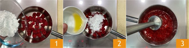 To prepare the chocolate-raspberry lava cake, the first thing to do is to focus on the raspberry coulis. Place the raspberries in a pot, add the powdered sugar 1, the lemon juice, and bring to a boil for 3-4 minutes. Blend for a few seconds with an immersion blender 3.