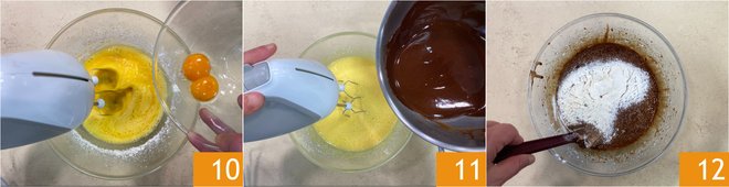 Then add the yolks 10 and, continuing to beat, also the melted chocolate 11. Finally, add the sifted flour and gently incorporate it with movements from the bottom up to avoid deflating the mixture 12.