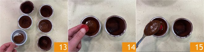 Butter and sprinkle the molds with cocoa 13, then fill them halfway with the batter. Match 2 half-spheres of coulis and position them in the center 14, then cover with more batter until the molds are filled 15. Bake in a preheated static oven at 375°F for 15-16 minutes.