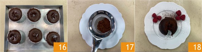 Once cooked 16, remove from the oven and let the cakes rest for 5 minutes, then unmold by turning the mold onto a plate. Garnish with cocoa 17 and fresh raspberries. Your chocolate-raspberry lava cake is ready to be served 18!