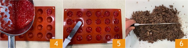 Pour the coulis into a half-sphere ice mold 4, level it with a spatula 5, and freeze. Coarsely chop the chocolate 6.