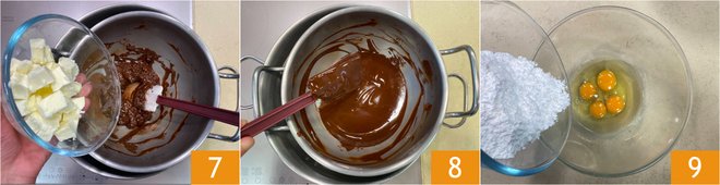 Melt the chocolate in a double boiler along with the butter 7, then set aside 8. In a bowl, crack the eggs and add the powdered sugar 9. Beat with an electric mixer.