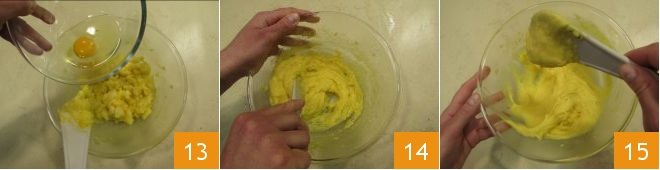 Transfer the obtained dough into a bowl 10 and add one egg at a time 11 always stirring with a spatula 12 to incorporate it. Don't worry if at first the dough seems separated, by continuing to stir.
