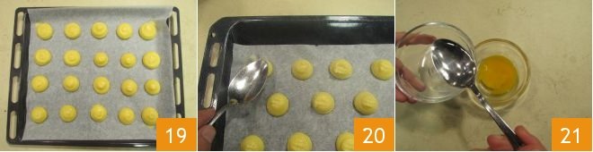 Once you have filled the tray 19, with a spoon slightly moistened, lightly flatten the surface of the balls to dull the tip of the cream puffs 20. Then beat the yolk in a small bowl with a bit of water 21