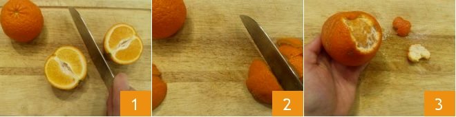 To prepare clementine sponge cake, wash and dry the clementines. Then take 10 oz from the total amount and coarsely chop it up, without removing the peel (1-2). Peel the remaining clementines 3,