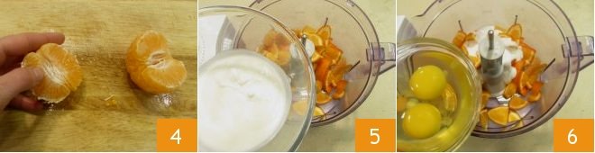 divide each one in half 4. Now place the peeled clementines and unpeeled coarsely chopped ones in the mixer, along with the yogurt 5, eggs 6,