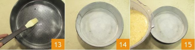 Butter and flour a baking pan (13-14). Pour the mixture into the pan 15