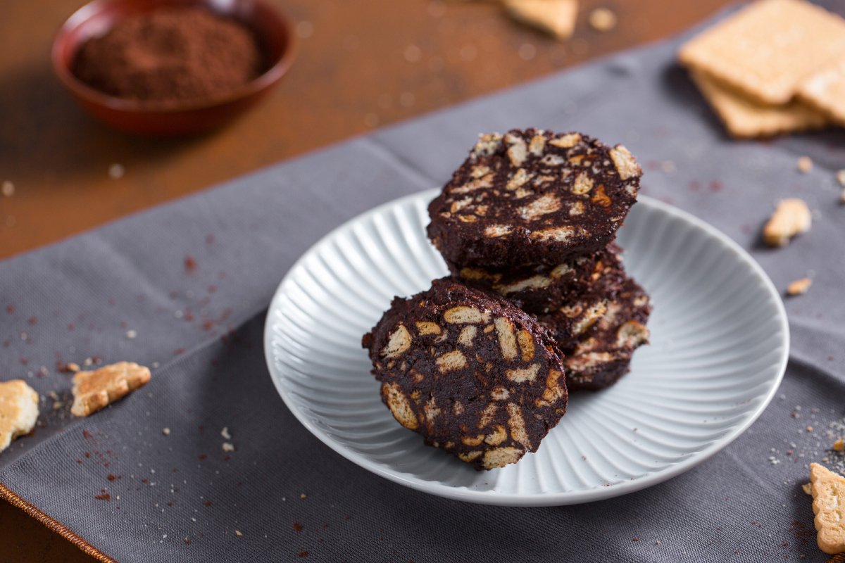 Cocoa salami is a version of the popular chocolate salami, a typical home made preparation that is one of the simplest and quickest no-bake desserts ever, perfect on every occasion: as a delicious snack, a welcome addition to any party buffet or the perfect sweet ending to a meal. This version is even quicker to make: simply replace the melted chocolate with bitter cocoa. It really will be love at first bite with this tantalizing sweet salami!