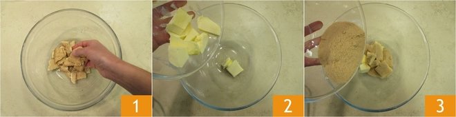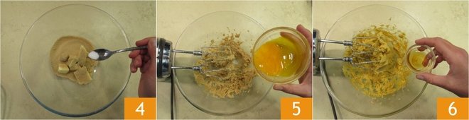 To make cocoa salami, start by crumbling the cookies 1; leave them to one side. Place the soft butter 2 and the brown sugar 3 in a large bowl.