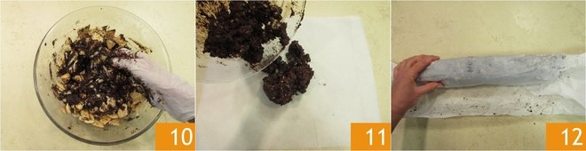 Thoroughly stir the ingredients together 10. Place the dough on a sheet of parchment paper 11 and shape it into a sausage by rolling in the paper 12.