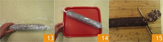 Press down to make the salami more compact and wrap with the plastic wrap 13. Leave in the refrigerator to firm up for around 2 hours. Cut the cocoa salami into slices and enjoy 15!