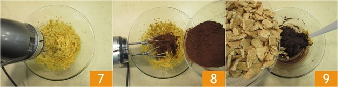 Stir some more until fully absorbed 7. Lastly, add the sieved bitter cocoa 8 and beat with the electric whisk for a few seconds. Stir the crumbled biscuits in 9.
