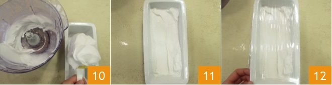 Pour the obtained mixture into a container (10-11), cover with plastic wrap 12, and place back in the freezer for another 2 hours. After this time, the coconut ice cream will be ready to be enjoyed.