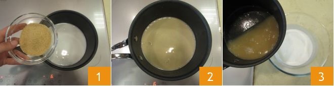 To prepare the coconut milk ice cream, first pour almond milk into a saucepan, add brown sugar 1 and heat it until it has melted completely 2. Then pour coconut milk in another bowl and add the almond milk to it 3.