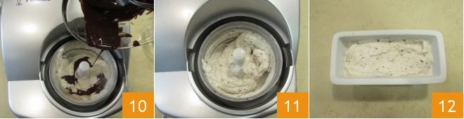pour the chocolate very slowly, while the machine continues mixing 10. This way you will get a stracciatella-like effect. Mix the ice cream for another 10 minutes until it reaches the right consistency 11. And you can enjoy the coconut milk ice cream or store it in the freezer in a bowl with high sides 12.