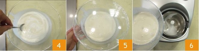Mix 4, cover with plastic wrap 5 and place in the refrigerator to harden for at least 30 minutes. Pour the ice cream into your self-refrigerating ice cream maker 6