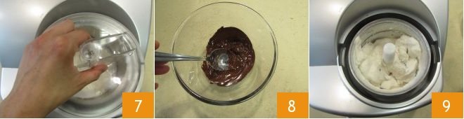 cover with the lid 7 and work the ice cream for at least 25 minutes. Then, coarsely chop the chocolate and melt it in a bain-marie, or in the microwave 8. As soon as the ice cream is well solidified 9