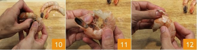 Now let's clean the shrimps (alternatively you can use the prawns): remove the heads by applying a slight pressure with your hands between the head and the body 10. Remove the legs 11 and extract the meat from the shell 12, but without detaching the tail.